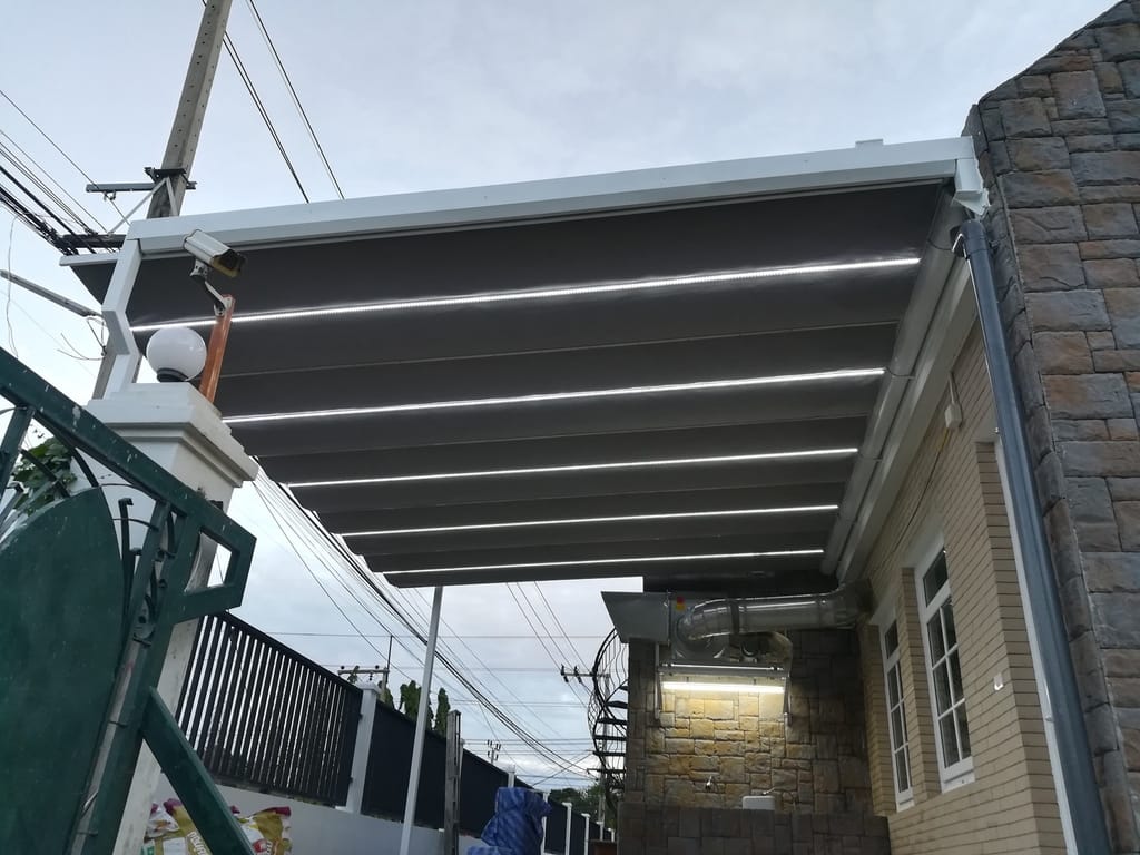 - หลังคาผ้าใบเปิด-ปิดได้ แบบนำเข้าจากยุโรป จะใช้โครงสร้างอะลูมิเนียมหนาพิเศษ มีสีให้เลือกตามมาตรฐาน RAL โดยโครงสร้างไม่เป็นสนิม ทนทาน รับน้ำหนักได้ พร้อมรางน้ำ built-in ในเซ็ต